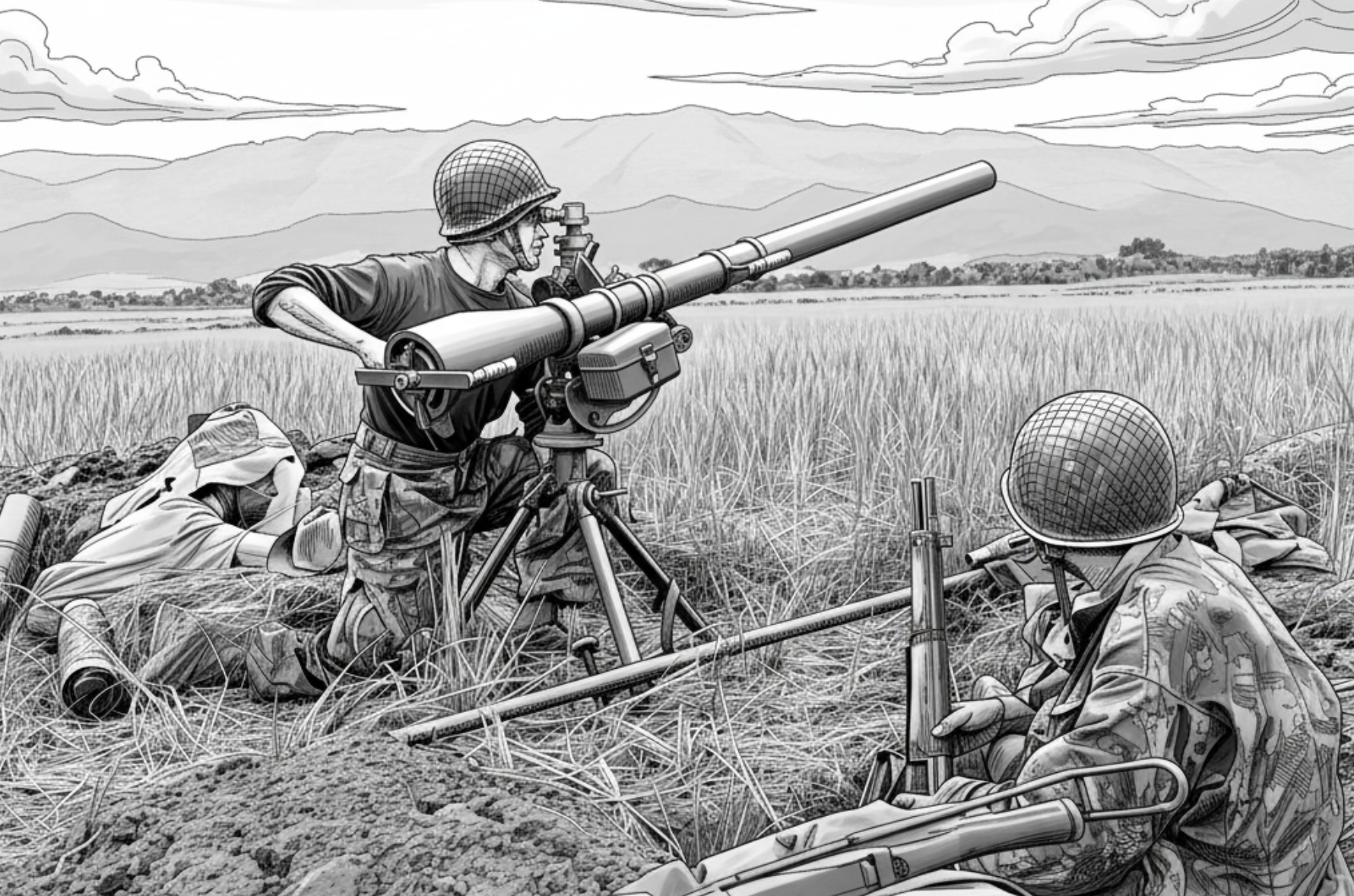 Pour le matériel, on choisit le 75 SR malgré ses défauts bien connus : faible allonge, flamme visible au départ du coup, trajectoire tendue. Quelques artilleurs chenus, du fond d’un bureau de Paris ou d’Hanoï, l’avaient préféré au mortier rayé de 4 pouces 2 (106 mm environ), sans doute parce qu’il s’appelait canon… Ils ignoraient probablement qu’il était prévu en priorité pour fournir des feux directs et tendus et non des feux indirects.
