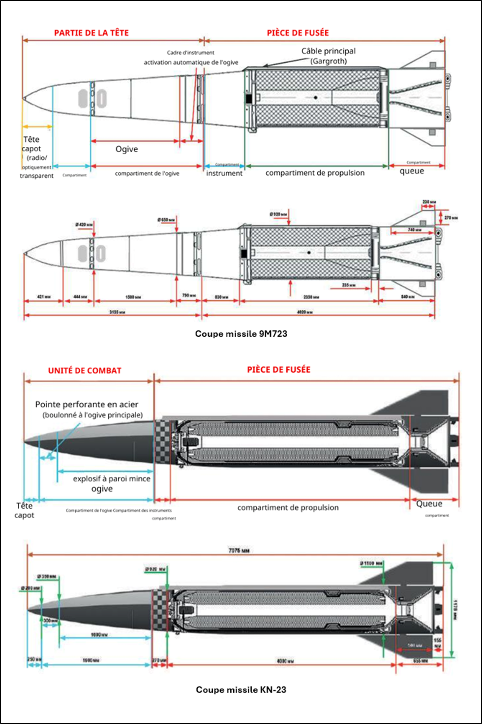 L’architecture des missiles étudiés demeure globalement conforme aux standards des missiles balistiques tactiques modernes. La partie arrière abrite le moteur à propergol solide, tandis que la section avant regroupe la charge militaire ainsi que les équipements de guidage et de pilotage. Certaines versions du 9M723 russes intègrent en outre un autodirecteur destiné à améliorer la précision terminale.