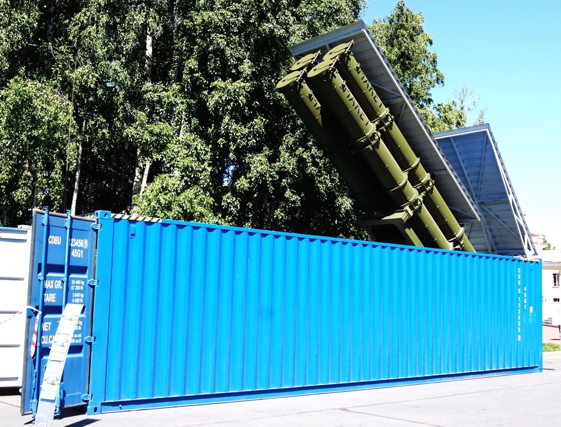 Conteneur maritime intégrant 4 missiles Kalibr prêt au tir.