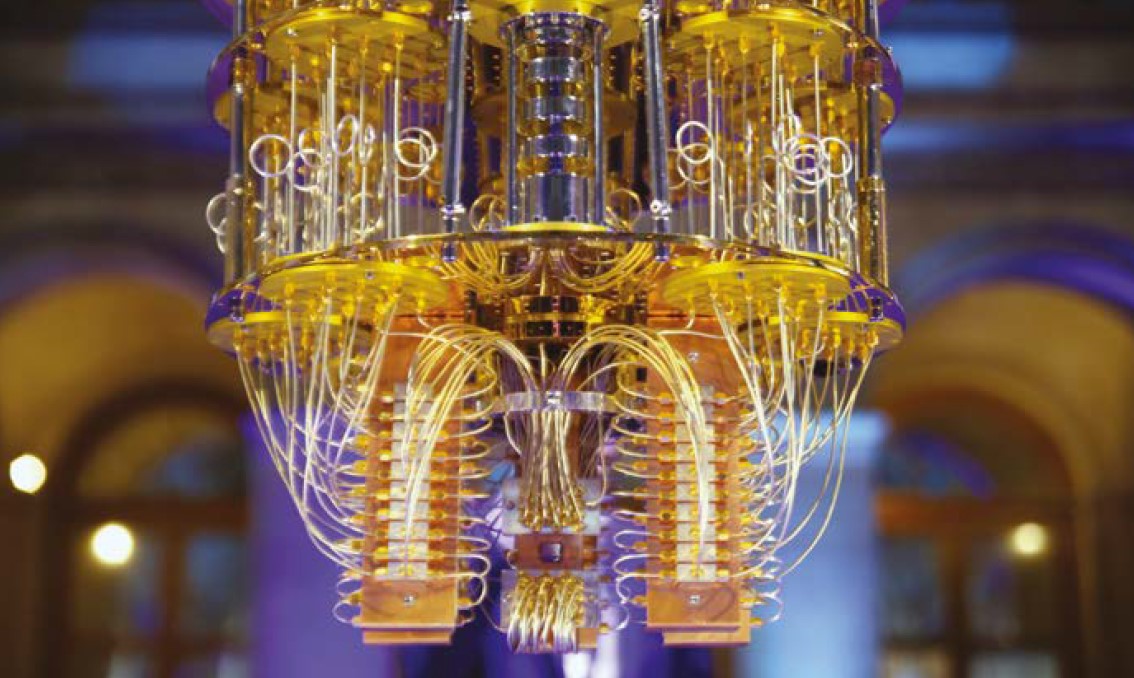 Ordinateur quantique à circuits supraconducteurs, suspendu dans une architecture cryogénique dorée, conçu pour manipuler des qubits grâce à des signaux ultraprécis à des températures proches du zéro absolu. Crédit : PICASA.