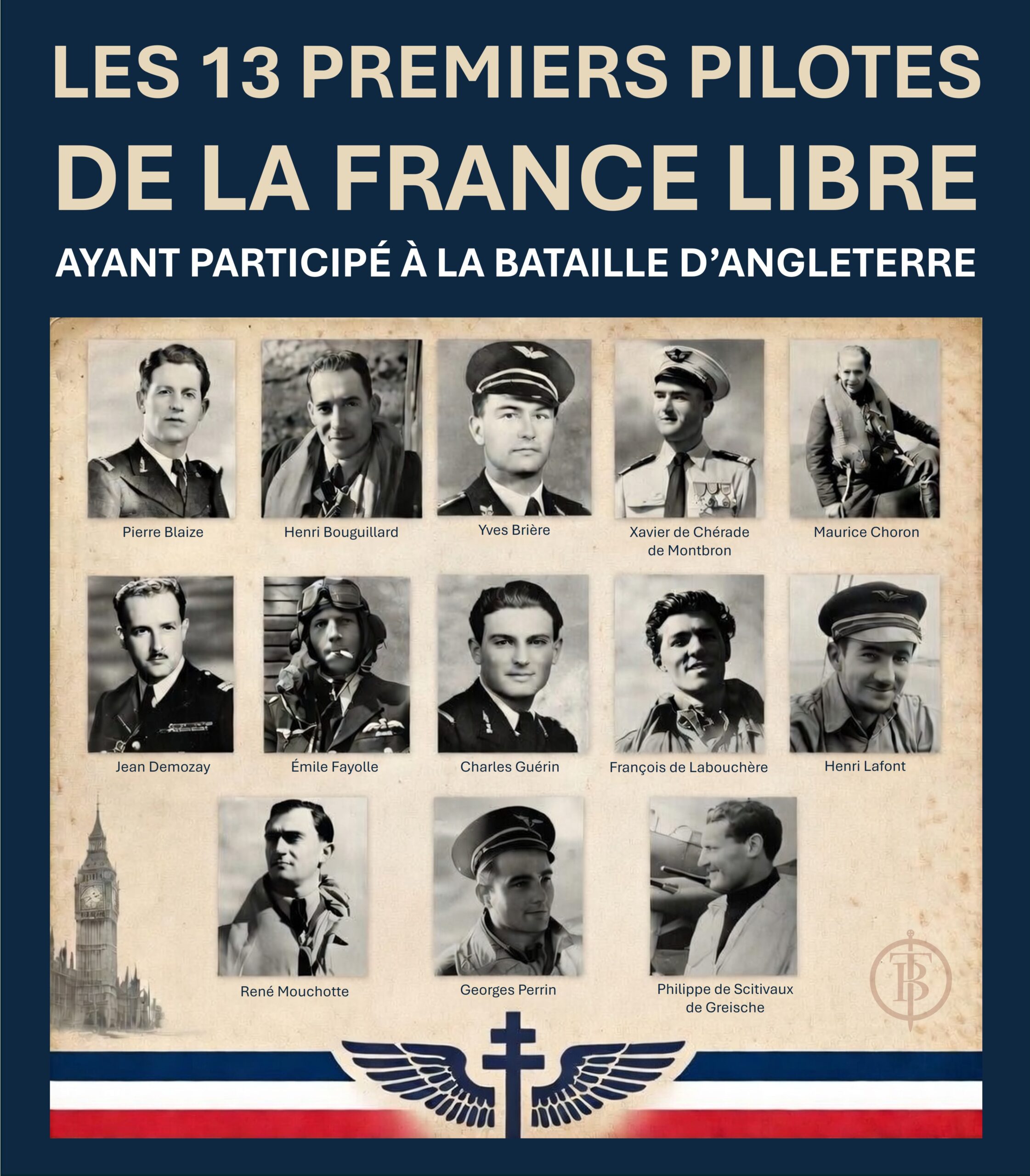 Au cours de l’été et de l’automne 1940, alors que la Royal Air Force affronte seule la Luftwaffe dans ce qui deviendra la bataille d’Angleterre, 13 pilotes français combattent dans les rangs britanniques. Intégrés individuellement au sein de différents squadrons de la RAF, ils forment alors le quatrième contingent étranger par le nombre, derrière les Polonais, les Tchèques et les Belges. Leur présence, bien que numériquement modeste – 13 hommes parmi les quelque 2 936 pilotes engagés dans la bataille –, revêt une portée symbolique : la France libre du Général de Gaulle est présente dans le combat aérien le plus décisif du début de la guerre.