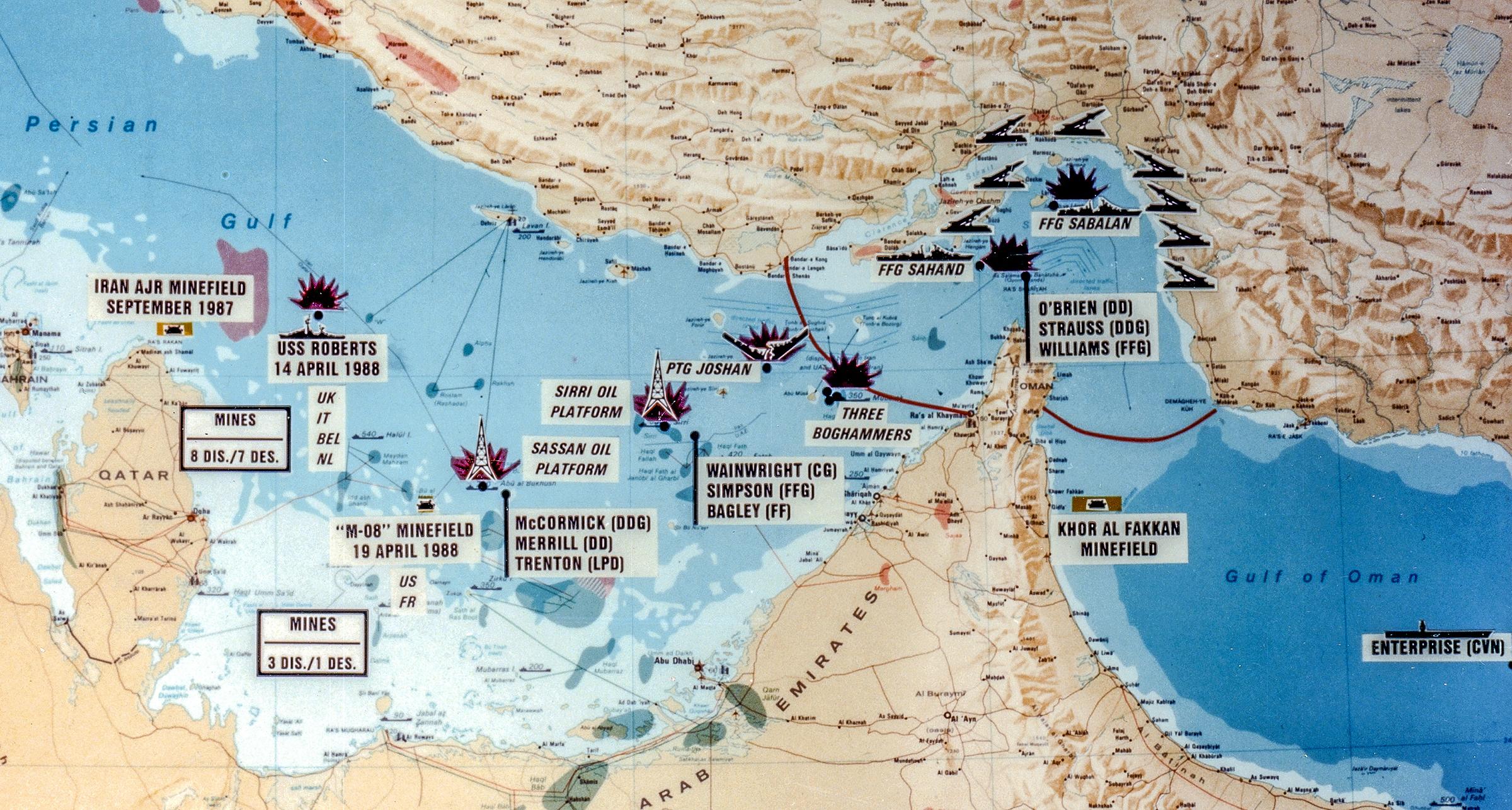 Le 14 avril 1988, la frégate USS Samuel B. Roberts heurte une mine dans les eaux internationales. L’explosion provoque une brèche importante et déclenche un incendie, rapidement maîtrisé par l’équipage. Le navire sera remorqué aux États-Unis. L’incident, grave mais contenu, devient immédiatement un point de bascule stratégique.