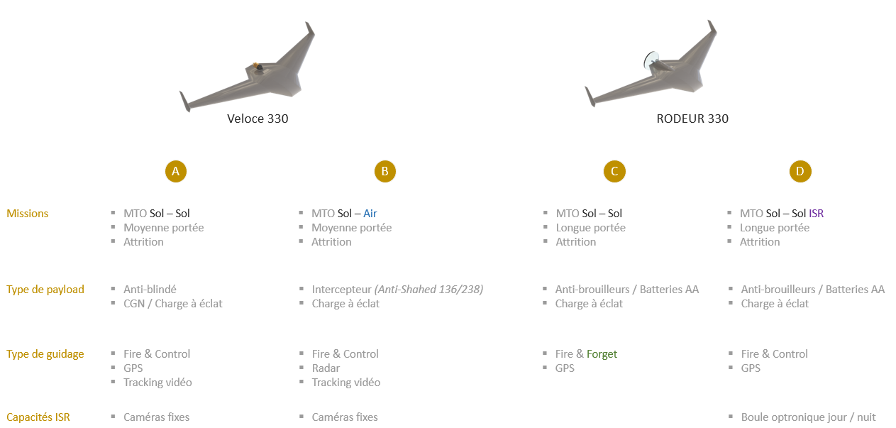 Le RODEUR 330 appartient à la catégorie émergente des munitions rôdeuses, également appelées munitions téléopérées ou drones « kamikazes ». Ce type d’armement combine les caractéristiques d’un drone de reconnaissance et celles d’une munition guidée de précision. Contrairement aux missiles traditionnels qui suivent une trajectoire balistique prédéfinie, le RODEUR 330 offre à l’opérateur la capacité de maintenir le contrôle du système tout au long de sa mission.