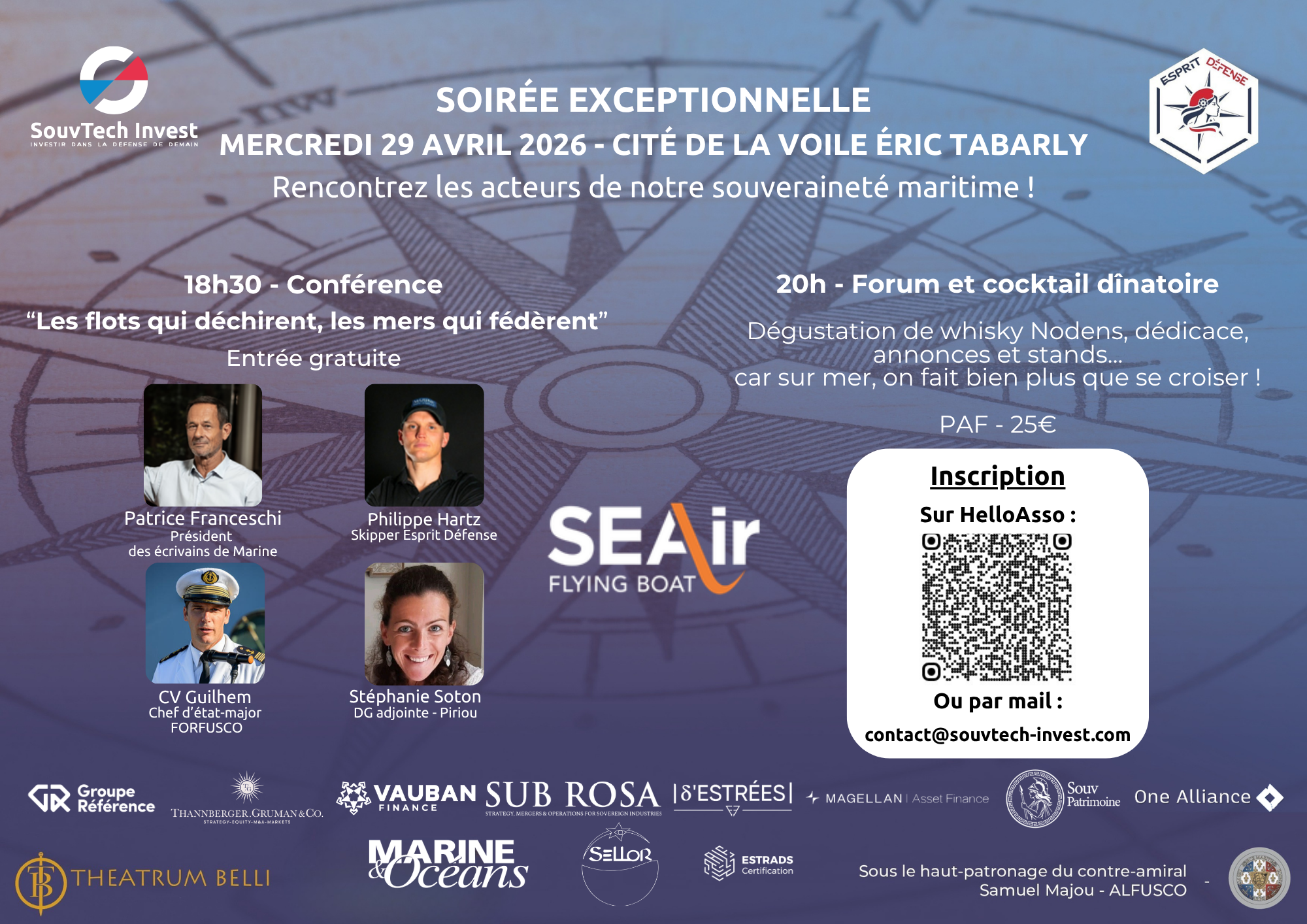 Esprit Défense, SEAir et SouvTech Invest organisent une soirée exceptionnelle à Lorient autour de la mer, de l’engagement et de la souveraineté.